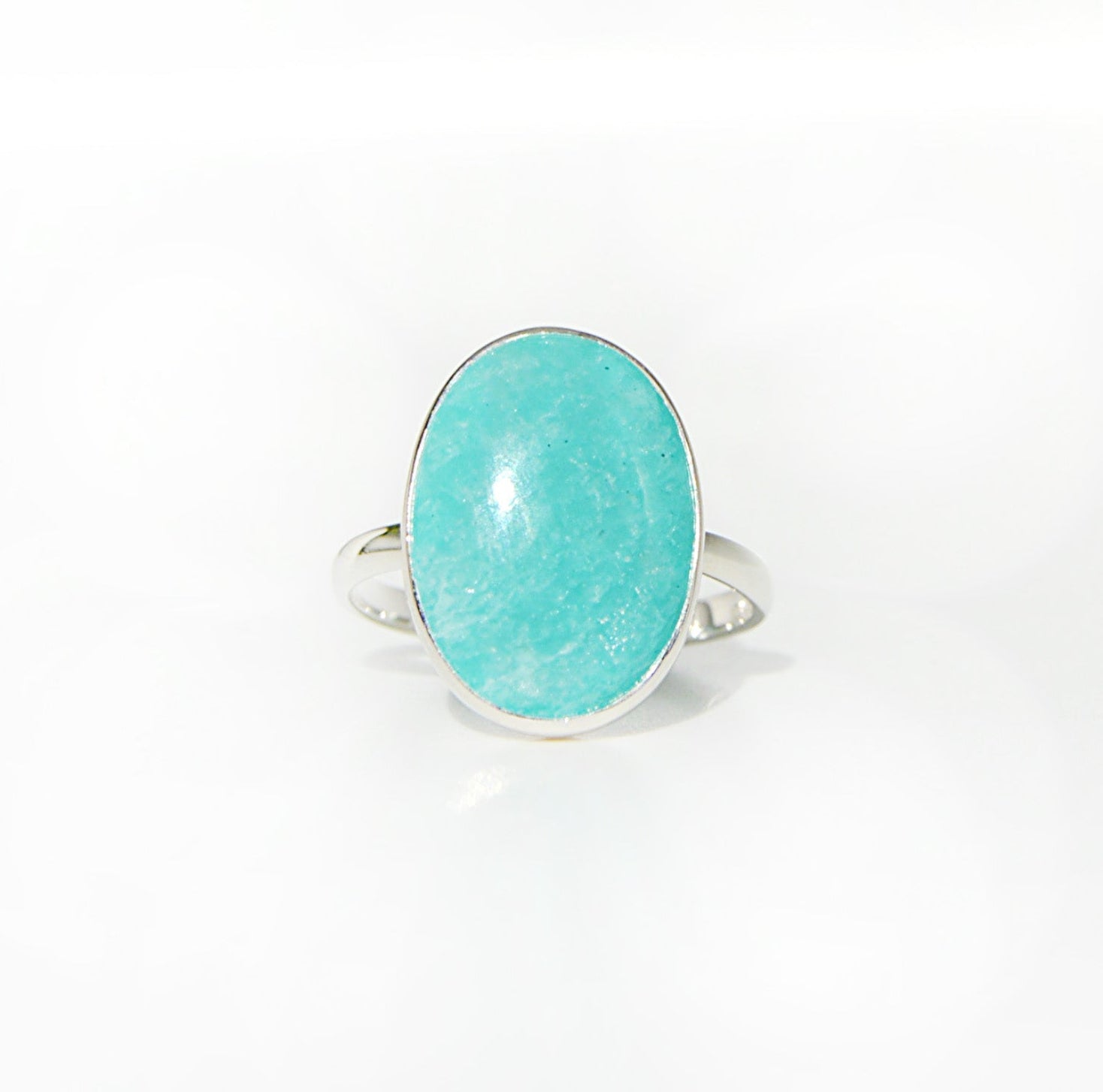 Rock this playful amazonite oval ring in sterling silver! The dreamy blue-green stone brings good vibes and effortless style to your size 9 finger. Perfect for stacking or wearing solo.