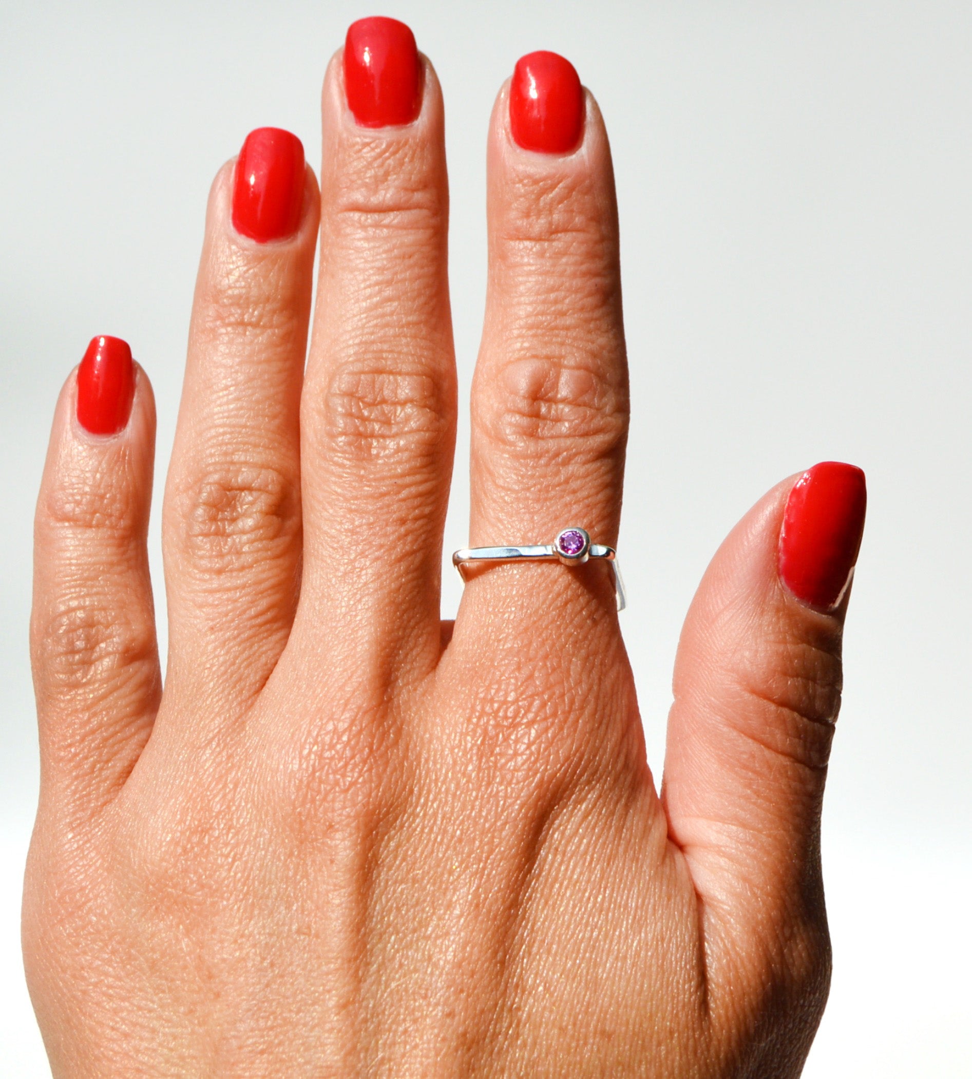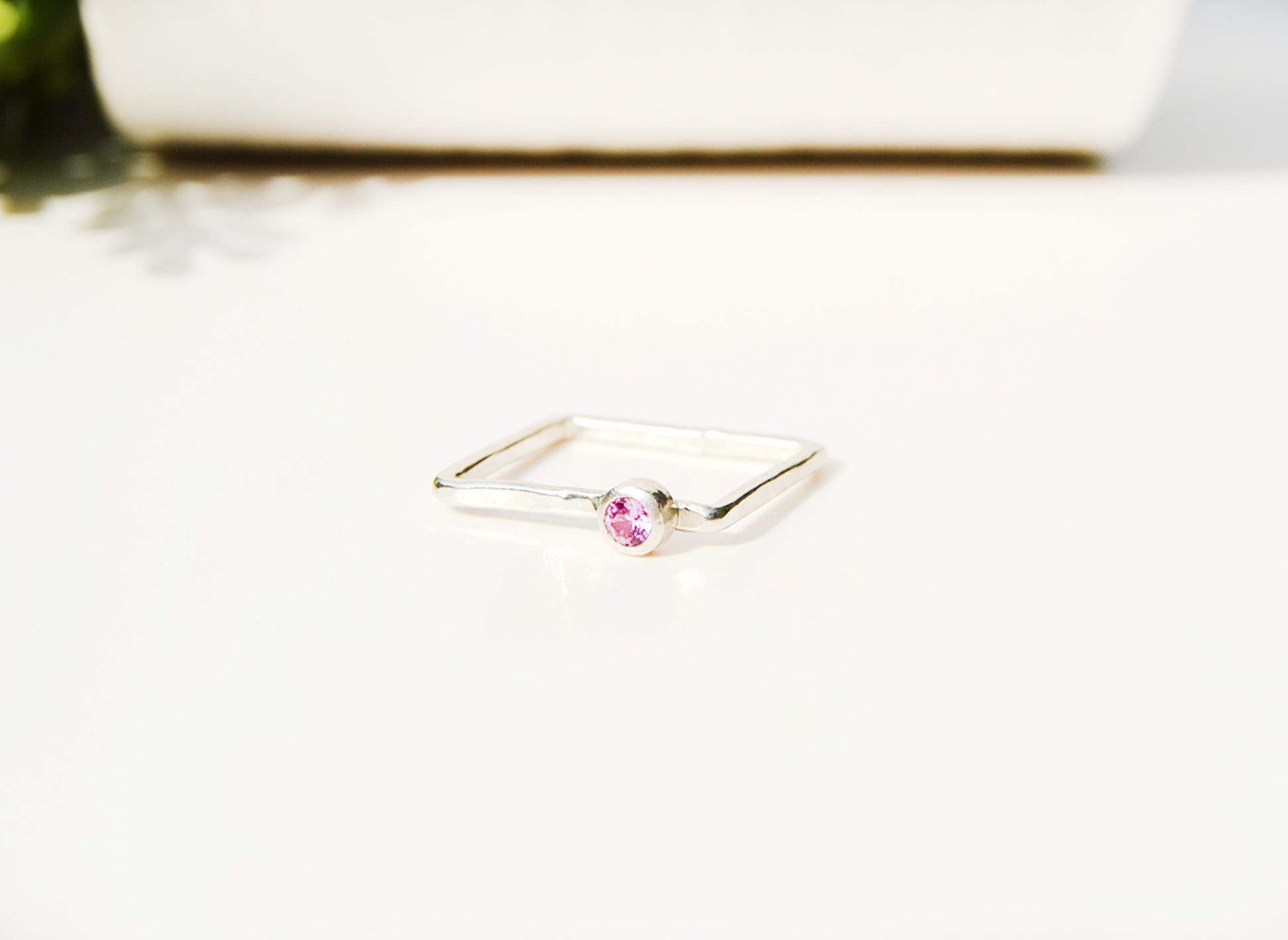 This elegant handmade sterling silver ring showcases a distinctive square band adorned with a vibrant pink tourmaline. Its sleek geometric design offers a contemporary twist on classic sophistication, making it a refined statement piece for any occasion.